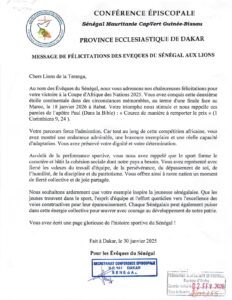 Communiqués Message de Félicitation de la Conférence Episcopale aux Lions du Sénégal Partager FacebookTwitterWhatsAppGoogle+Courriel